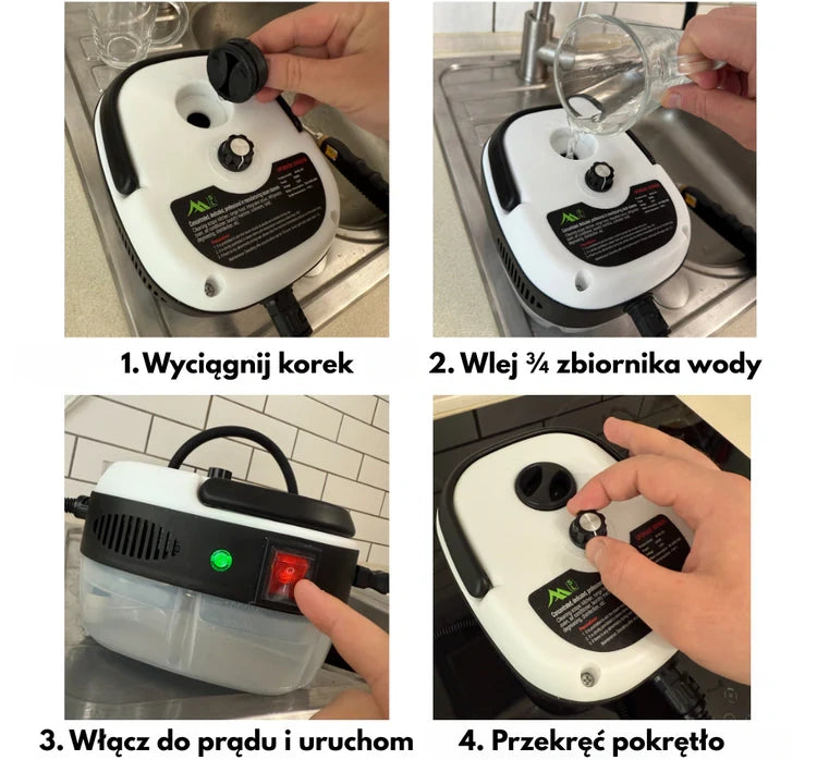 Wlej wodę, uruchom urządzenie i poczekaj na nagrzanie. Trzymaj dyszę w bezpiecznej odległości od skóry, dzieci i zwierząt — para jest bardzo gorąca.